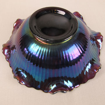 The large bowl has 42 scallops along the top edge, is about 8 to 9 inches across the top depending if it is ruffled or round and has a 3 1/4 inch base. The standard size bowl also has 42 scallops along the top edge, is about 7 to 8 inches across the top and has a 3 inch base. The large bowls are found mostly in amethyst and occasionally in smoke. The standard sized bowls are also found mostly in amethyst with marigold, green and smoke also found. Standard sized bowls in lime green, marigold on moonstone, teal and vaseline are more difficult to find. |