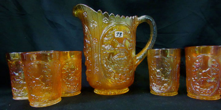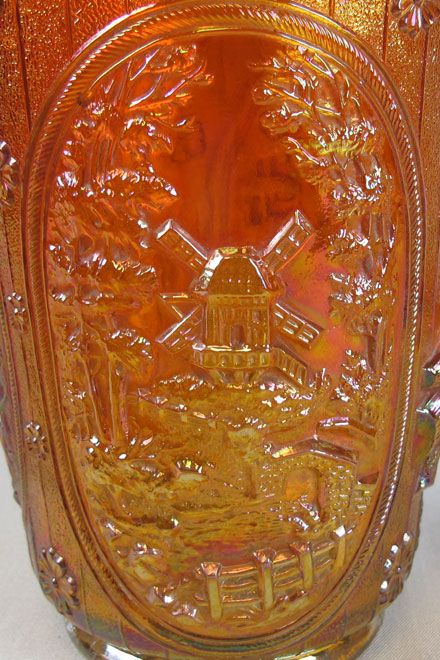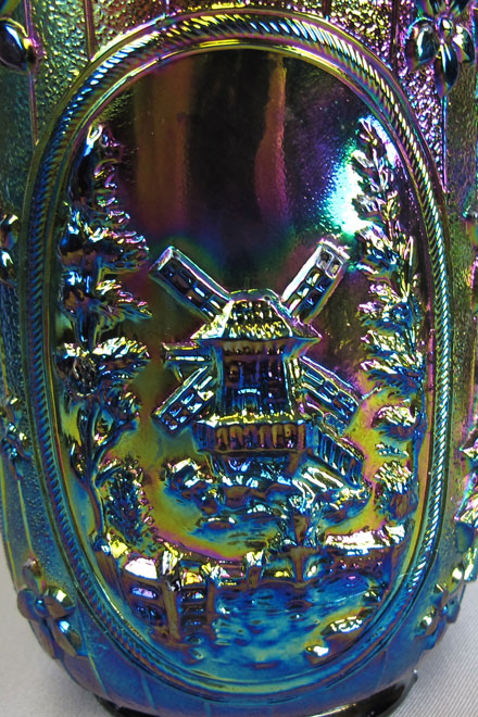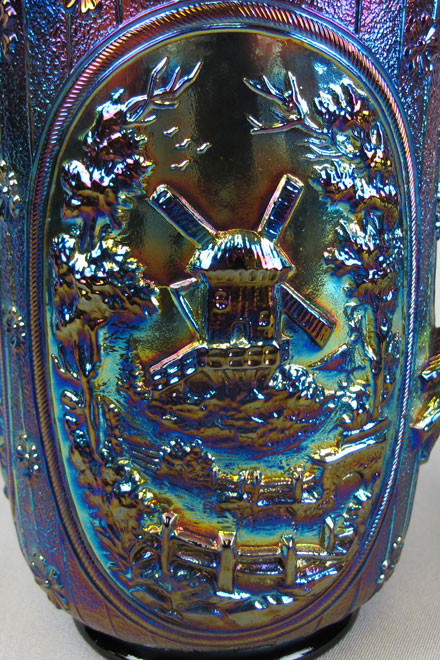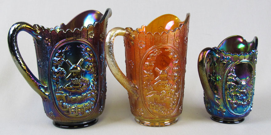 Milk pitchers are easily found in amethyst, green, marigold and smoke. Milk pitchers in lime green and vaseline would be rare. The smaller standard size pitcher is hard to find in any color but green, lime green, marigold, smoke and vaseline are known. The full size standard pitcher is also hard to find but have been sold in amethyst, marigold, smoke or violet blue. Windmill bowls, pickle dishes, and water sets were reproduced. |