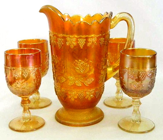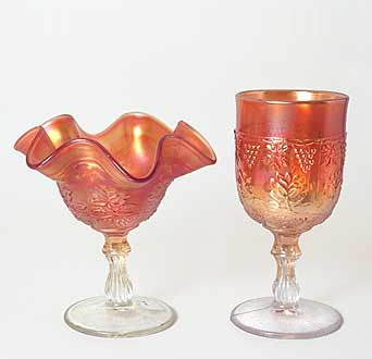 These smallish pitchers are referred to as cider pitchers. The set came with wine-type goblets. Only marigold pitchers were known until 1997 when a blue example turned up in the Pacific Northwest--and one sold at a Florida auction in 2001. Pitchers measure a little over 8 inches tall. The whimsied compote with ruffles at the left was made from the goblet.