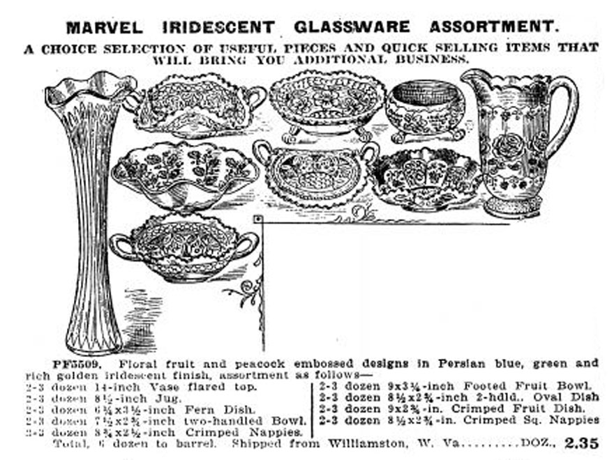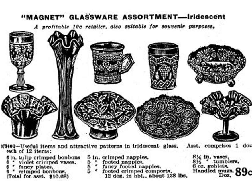 Although marigold is the primary color, goblets are found in other colors including aqua, blue, powder blue, lime green and vaseline. Below are two ads from 1919 showing the pattern Wine and Roses. The first shows a 8 1/2 inch jug and the second shows a six oz. goblet. Notice that in each ad, they are not being sold as a set. |