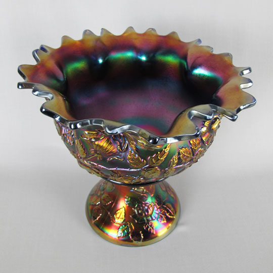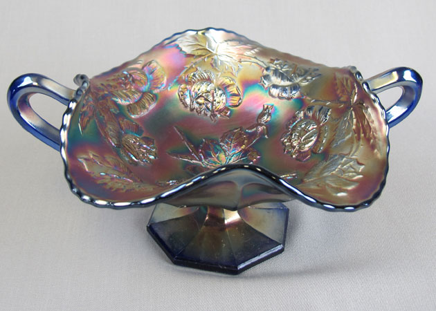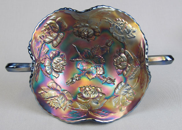 The stemmed two handled bonbon and compote are shown above. Bonbons can be confused with Fenton's Rose Bouquet or Northwood's Basket of Roses (though Basket of Roses is not stemmed). Compotes do not have the center rose. Bonbons and compotes are found in the same four colors of amethyst, blue, green and marigold. |