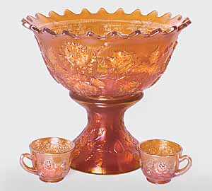 Fenton's Wreath of Roses pattern is found in stemmed bonbons, compotes, and punch sets.
